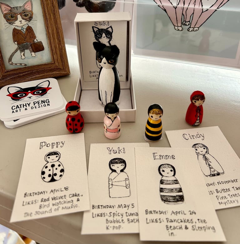 Interested in my one-of-a-kind hand-painted peg dolls? These are currently only available at in-person markets or local to YXE. Please contact me for more details at: info@cathypeng.com